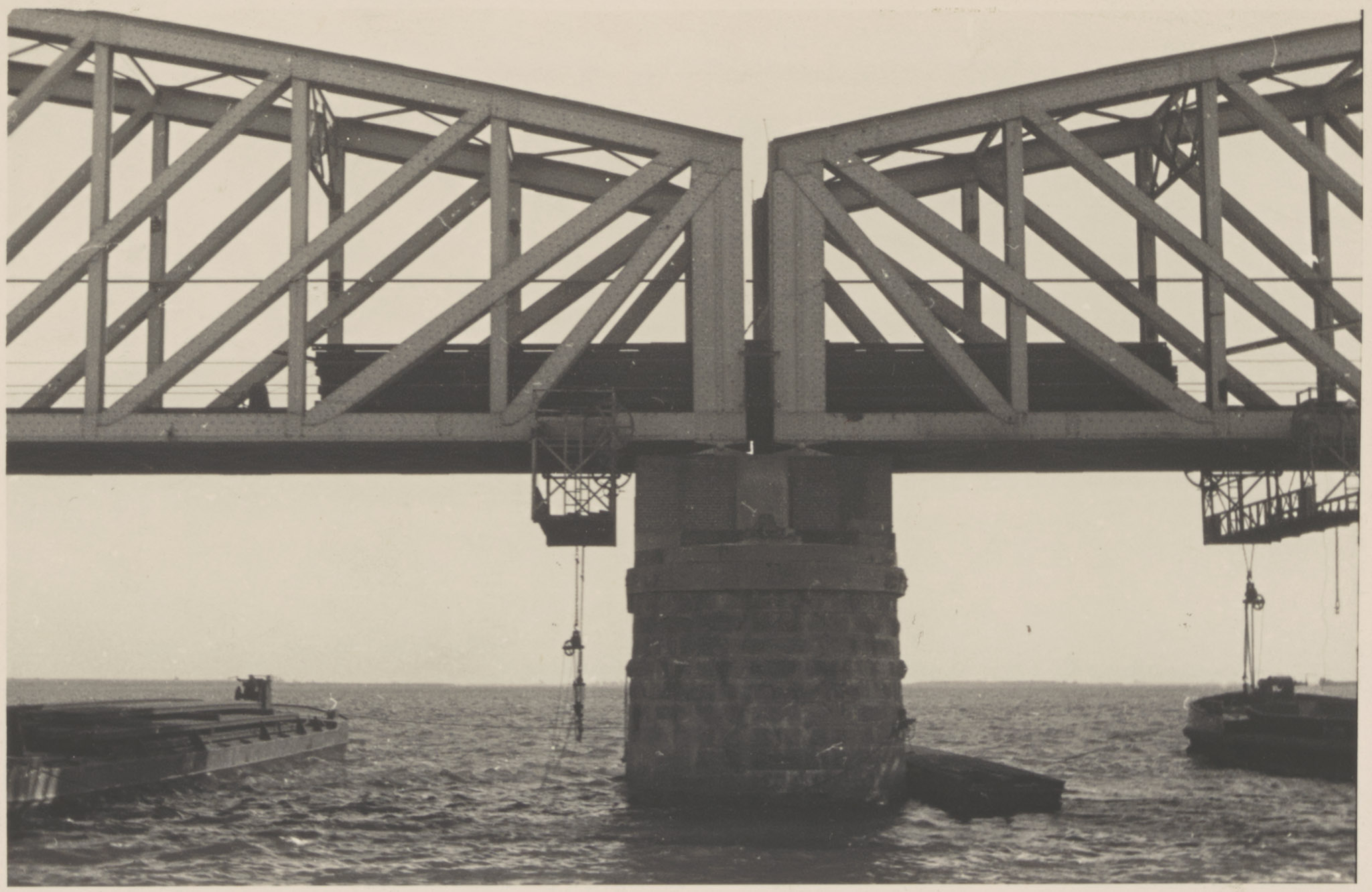 Radio-controlled Azon bombs released on the Moerdijk Bridge, Holland, 25 Aug. 1944. Bombardement door RAF en USAAF op de brug bij Moerdijk. Bezoeker schrijft: Waarschijnlijk foto's gemaakt i.v.m. Luchtdoelgeschut en Kriegsmarine in de dorpshaven van Moerdijk. Dit i.v.m. de bombardementen (om luchtdoelgeschut uit te schakelen) die plaatsvonden op 17 september 1944. De bommen vielen in het dorp Moerdijk ...