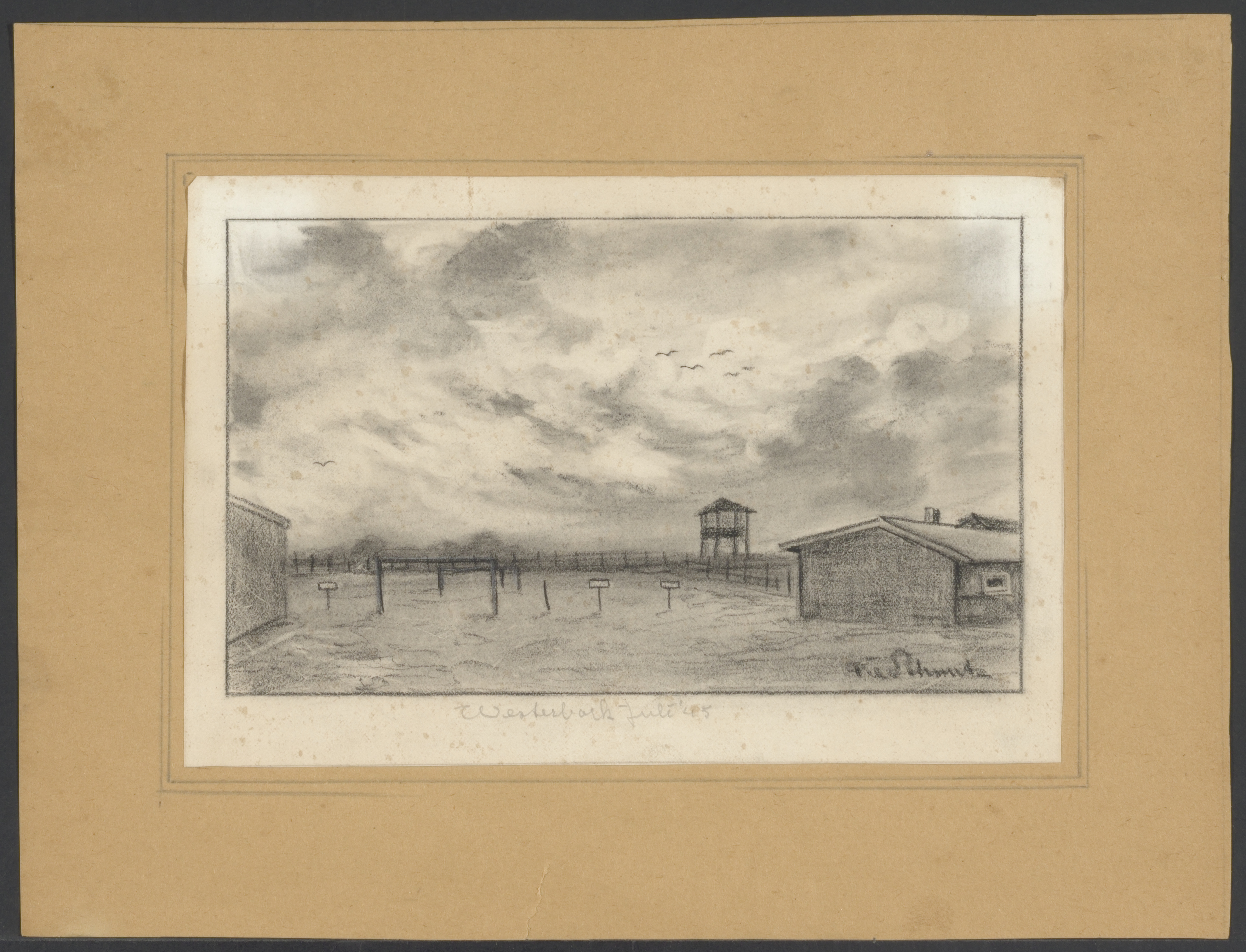 Binnen de afrastering staat een man. Achter de (dubbele) afrastering is wachttoren nr. 7 getekend. De kleuren zijn bijna geheel bruintinten aangezien op dat moment Van Hooff geen andere kleuren tot zijn beschikking had. Rechtsonder een rode driehoek (= politieke gevangene). Op achterzijde: Geprüft Stalag IV B. 26.