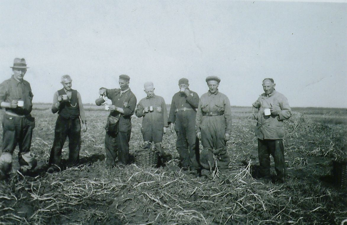 Foto van dwangarbeider aan het werk in de buurt van het Joods werkkamp Orvelte Plaats: Orvelte, Joods werkkamp Datum: 1942 van links naar rechts: Barend van Zuiden; ten Berge; Sam Meijer; Barend Stern; Rudolf van Zuiden; Israël Wijnberg; en Freerk Simons.