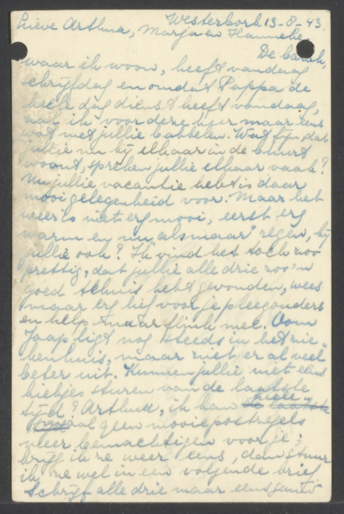Van: van Dijk-de Vries, J.H. (Juup) Aan: van Dijk, A. Th. Plaats: Westerbork, kamp Datum: 1943-08-13 Onderwerp: de barak heeft schrijfdag; pappa heeft de hele dag dienst (ketelhuis), tante zal de briefkaart daarom schrijven; alle drie zijn kinderen hebben een goed tehuis gevonden bij pleegouders in Vorden; oom Jaap ligt in het kampziekenhuis; hij kan voor zijn zoon niet meer aan postzegels komen; pappa ...