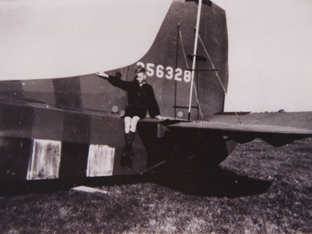 Foto van jongen op staartstuk van Amerikaans Waco CG-4A zweefvliegtuig. ,sernummer 3(?)56328